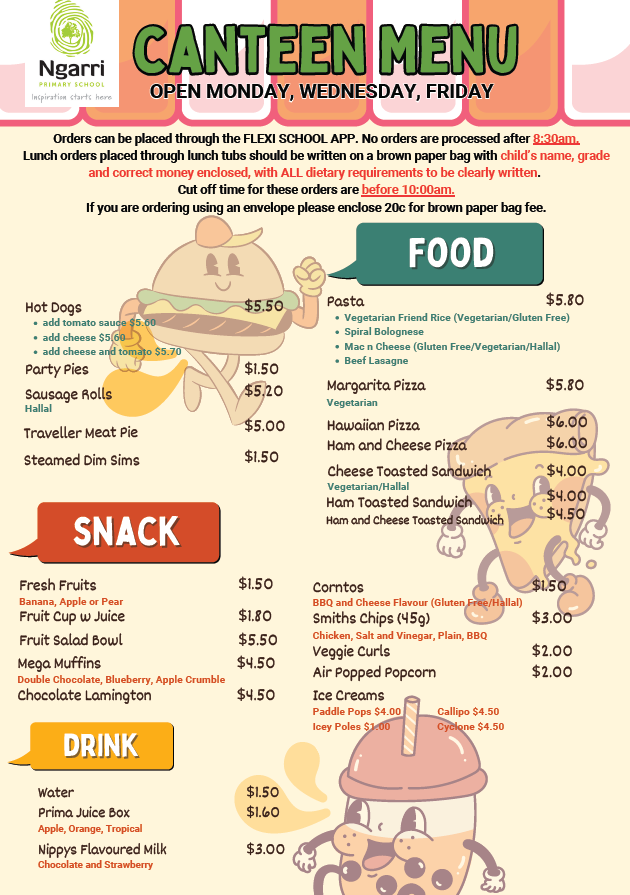 Orders can also be made through the Flexi school app OR www.flexischools.com - create an account and follow the prompts. Online ordering closes at 9am.